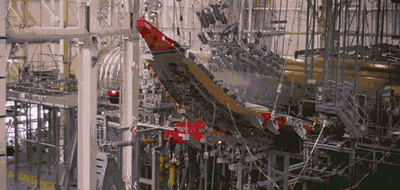 飛機(jī)在進(jìn)行靜力試驗(yàn)時(shí),被“五花大綁”固定起來(lái)。而機(jī)翼部分被多條鋼纜吊起來(lái),像小鳥(niǎo)揮舞翅膀一樣上下擺動(dòng),其彎曲變形幅度之大令人驚嘆,讓人不禁要問(wèn):飛機(jī)機(jī)翼到底能彎曲到什么程度?