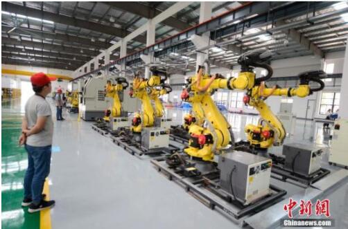 資料圖:眾多機(jī)器人在廠房?jī)?nèi)集體跳舞。中新社記者 楊華峰 攝