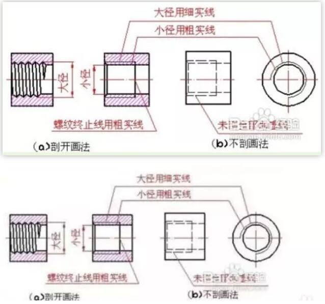 圖2是內(nèi)螺紋的畫法。剖開(kāi)表示時(shí)[圖(a)],牙底(大徑)為細(xì)實(shí)線,牙頂(小徑)及螺紋終止線為粗實(shí)線。不剖開(kāi)表示時(shí)[圖 (b)],牙底、牙頂和螺紋終止線皆為虛線。在垂直于螺紋軸線的視圖中,牙底仍然畫成約為3/4圈的細(xì)實(shí)線,并規(guī)定螺紋的倒角也省略不畫。